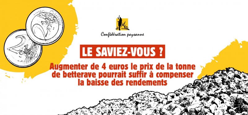 Les industriels et la filière betterave, avec l'appui du gouvernement, ont cherché à nous faire croire que l'impact de la jaunisse et donc l'interdiction des néonicotinoïdes mettraient en péril la filière et la sécurité en sucre alimentaire de la France. Faute de rendement lié à la jaunisse, la France devrait importer massivement du sucre pour nourrir la population. Faute de rendement lié à la jaunisse, les paysan.ne.s subiraient des pertes de rémunération importantes. Or dans le revenu il n'y a pas que le rendement, il y a aussi le prix payé aux producteur.trices !