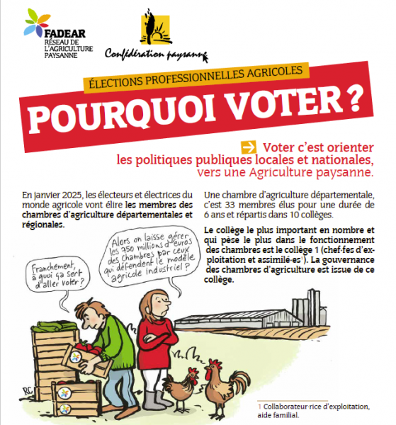 23.07.2024 - Brochure qui explicite les enjeux liés aux élections professionnelles agricoles et l'importance d'aller voter pour donner du poids au projet d'agriculture paysanne