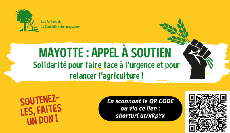 La Confédération paysanne, à la tête de la Chambre d'Agriculture, de la Pêche et de l'Aquaculture de Mayotte, soutient l'ensemble des agricultrices et agriculteurs de l'archipel.