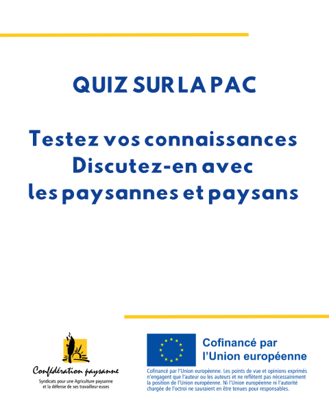 a créé un QUIZZ PAC* à destination du grand public. Ce quizz a été lancé sur notre stand au Salon international de l'agriculture. L’objectif : rendre compte de ce que représente la PAC* en termes d'aide publique, de bénéficiaires, d'objectifs environnementaux...