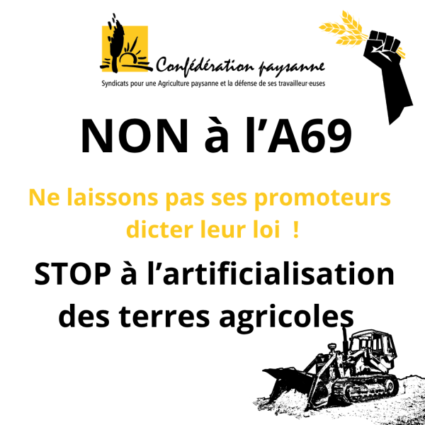 Nous nous associons à l'appel à solidarité lancé par le collectif La Voie est libre face à ce nouveau cran franchi dans la terreur en faveur d'un projet d'un autre temps. L'A69 est une entrave majeure à l'agriculture, elle accapare et artificialise le foncier, détruit les paysages et la biodiversité.