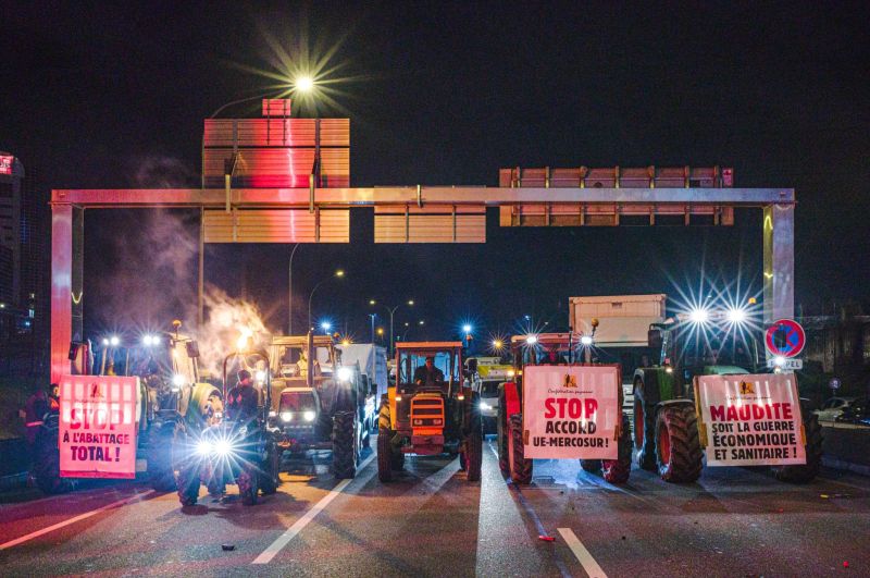 Paysan·nes de la Confédération paysanne et militant·es des Soulèvements de la terre mobilisé·es contre la maladie du libre-échange