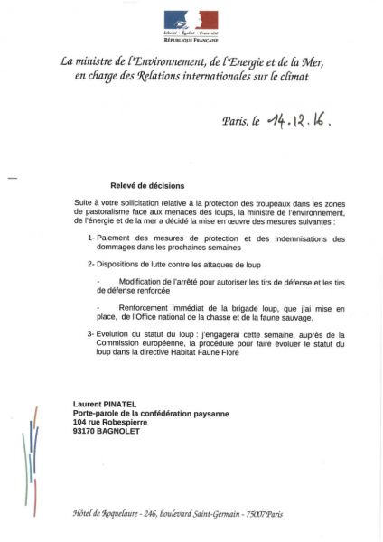 Il aura fallu moins de 24h d'occupation du jardin des Tuileries, à Paris, pour que la Confédération paysanne obtienne des engagements attendus par tous les éleveurs confrontés à la prédation depuis des années. Après de premières avancées actées au ministère de l'Agriculture à midi, c'est en pleine nuit que les services de la ministre de l'Environnement ont, eux aussi, pris des engagements écrits :