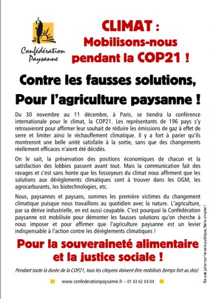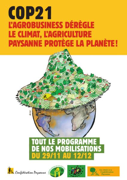 La Confédération paysanne est partie prenante de la Coalition Climat 21 qui regroupe plus d'une centaine d'organisations en France. Par ailleurs, nous recevrons, pendant la durée de la COP21, des militants de la Via Campesina venus du monde entier.