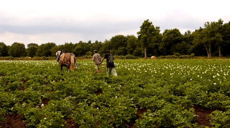 L'absence des contraintes économiques classiques et l'entraide permettent de pouvoir expérimenter des technique culturales particulières : j'entretiens mes légumes à l'aide d'une jument de trait breton (photo), attelée de matériels modernes. Tous les ans, un demi-hectare d'oignons est cultivé conjointement avec un comité de Rennes contre l'aéroport de Notre-Dame : ici on assure le suivi technique global, eux viennent à 25 pour 2-3 chantiers manuels. La production (6 tonnes en 2015) est ensuite partagée selon les besoins. Une partie part gratuitement en soutien (Zads, aide aux sans-papiers, mouvements sociaux...). Les frais de la culture sont assumés conjointement.