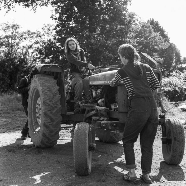 Une ou deux personnes sont référentes de chacun de nous : elles ont du boulot, parce qu'il faut bien dire qu'on a sale caractère, on pète vite une durite. Bon, dans ce cas là, les responsables nous mettent en arrêt maladie jusqu'au prochain chantier collectif. Les chantiers mécaniques, on s'y retrouve à 3 ou 4 tracteurs, les référent·e·s de chaque tracteur et toutes celles et ceux qui veulent participer. Parfois, ils sont 15 ou 20, à faire aussi bien l'entretien courant que des grosses réparations... ou à préparer les repas.