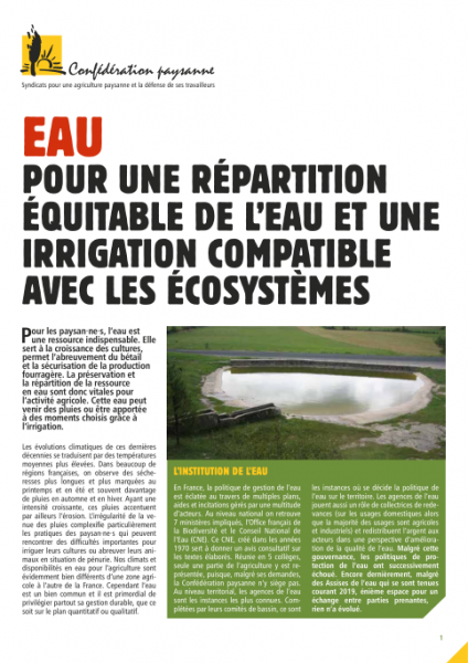 La disponibilité de l'eau est de plus en plus affaiblie, aussi bien en quantité qu'en qualité. Or les paysan·nes, qu'ils irriguent ou non, ont besoin d'eau pour produire de l'alimentation. Malheureusement, alors que seulement 7 % de la surface agricole utile (SAU*) est irriguée, le traitement agricole de la gestion de l'eau est trop souvent résumé à l'irrigation.