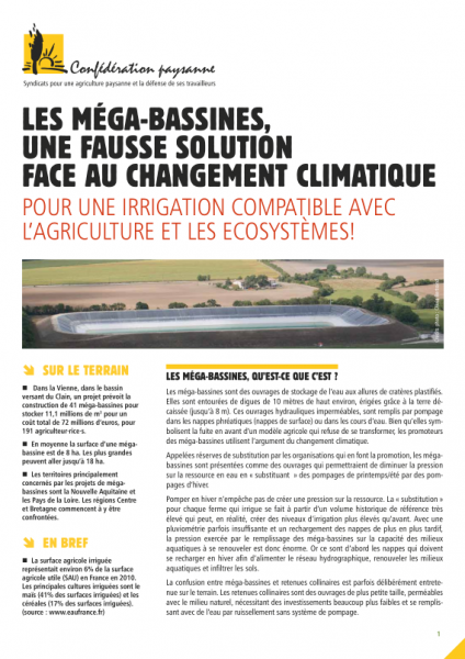 La fin des méga-bassines et de tous les ouvrages d'irrigation qui pompent l'eau de manière massive des espaces naturels de stockage pour alimenter une agriculture industrielle hyper consommatrice d'eau. Le stockage de l'eau peut être une solution de dernier recours, à condition que sa mise en place permette au maximum une infiltration de l'eau dans le sol. Les retenues alimentées par ruissellement et si possible sans bâche plastique (fonction de la perméabilité du sol) sont à privilégier.