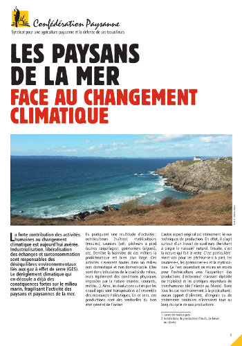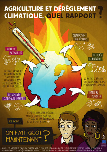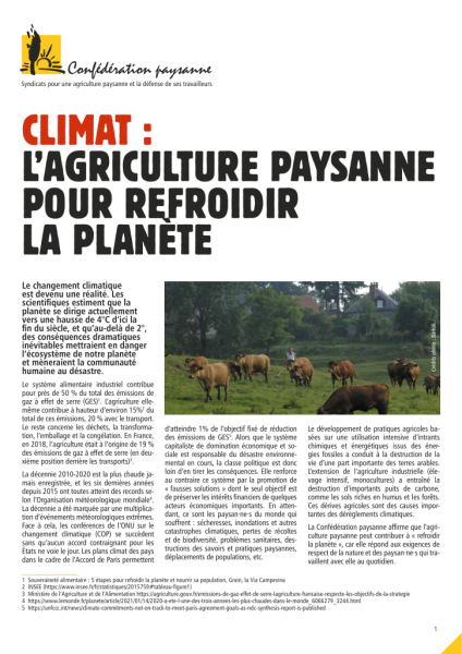 La décennie 2010-2020 est la plus chaude jamais enregistrée, et la décennie a été marquée par une multiplication d'événements météorologiques extrêmes et les années 2022-2023 ont vu se succéder les sécheresses suivies d'inondations sur toute la façade atlantique et dans le Nord. Face à cela, les conférences de l'ONU* sur le changement climatique (COP*) se succèdent sans qu'aucun accord contraignant pour les États ne voie le jour. Les plans climat des pays dans le cadre de l'Accord de Paris permettent d'atteindre 1% de l'objectif fixé de réduction des émissions de GES . Alors que le système capitaliste de domination économique et sociale est responsable du désastre environnemental en cours, la classe politique est donc loin d'en tirer les conséquences. Elle renforce au contraire ce système par la promotion de « fausses solutions » dont le seul objectif est de préserver les intérêts financiers de quelques acteurs économiques importants. En attendant, ce sont les paysan·ne·s du monde qui souffrent : sécheresses, inondations et autres catastrophes climatiques, perte de récoltes et de biodiversité, problèmes sanitaires, destructions des savoirs et pratiques paysannes, déplacements de populations, etc.