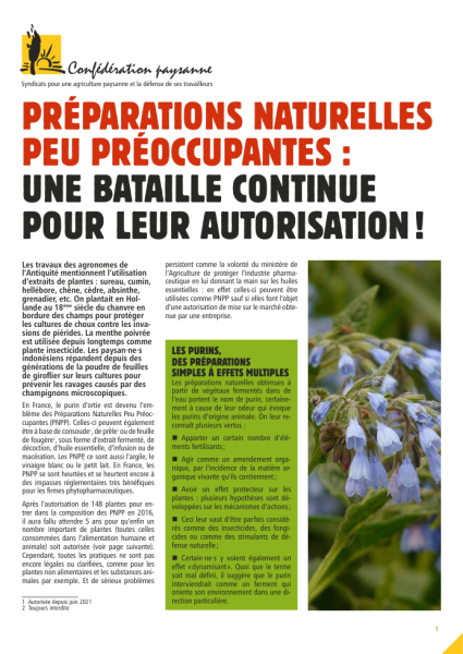 En France, les purins d'ortie et de consoude sont devenus les emblèmes des préparations naturelles peu préoccupantes (PNPP*), alternatives aux pesticides. Celles-ci peuvent également être à base de prêle ou de fougère, sous forme d'extrait fermenté, d'infusion ou de macération. Les PNPP*, ce sont aussi l'argile, le vinaigre blanc ou le petit lait. En 2006, ces préparations ont été interdites d'un coup, déclenchant la guerre de l'ortie suite à un contrôle chez un paysan. Ces 15 dernières années, la Confédération paysanne et ses partenaires, dont l'Aspro-PNPP*, se sont fortement mobilisés pour que ces prépa- rations soient réautorisées. Malgré la volonté de l'administration, la Confédération paysanne s'est battue pour qu'elles le soient en dehors de la réglementation des pesticides, car elles n'ont strictement rien à voir avec les pesticides et leurs dangers. Grâce à toutes ces années de manifestations, rendez-vous institutionnels, campagnes de communication, organisations de rencontres, nous avons remporté des victoires importantes :