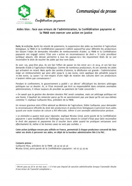 Aides bios : face aux erreurs de l’administration, la Confédération paysanne et la FNAB vont exercer une action en justice