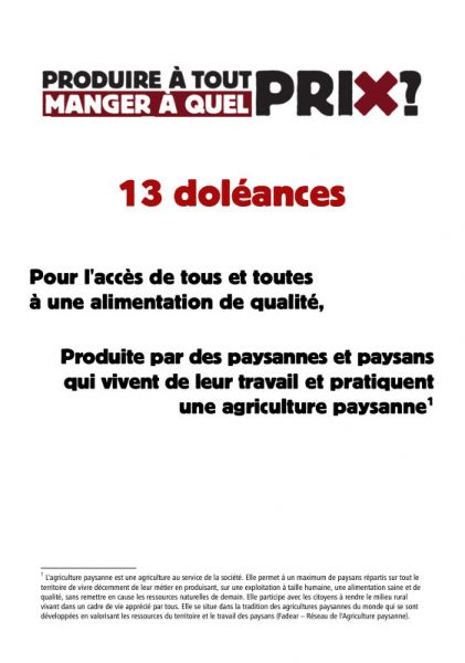 13 doléances Pour l'accès de tous et toutes à une alimentation de qualité, Produite par des paysannes et paysans qui vivent de leur travail et pratiquent une agriculture paysanne Nos constats : Une industrialisation toujours plus poussée de l'ensemble de la ...
