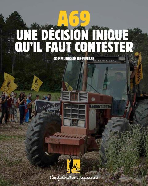 La Confédération paysanne s'indigne de la décision, sur le fond, de la Cour administrative d'appel sur le dossier de l'A69, suite au recours déposé par l'État contre le jugement sur le fond par le tribunal de Toulouse invalidant l'autorisation environnementale pour cause d'absence de RIIPM ...