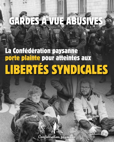 Ces plaintes, déposées au nom des gardé·es à vue et du syndicat, font suite à la répression syndicale menée lors de l'action symbolique au Ministère de l'agriculture, à la DGPE, le 14 janvier dernier pour dénoncer les atteintes à l'agriculture paysanne et à la souveraineté alimentaire dans ...